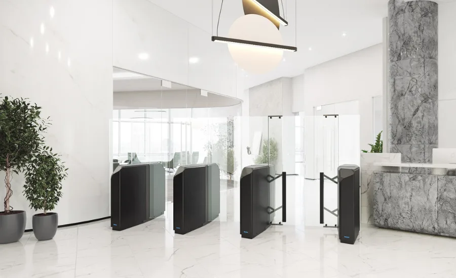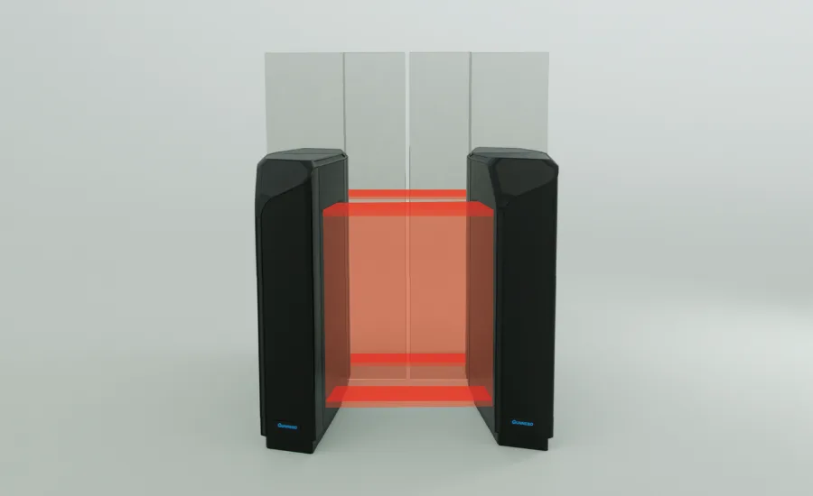 Het elegante, schuine ontwerp leidt gebruikers op een veilige manier naar de juiste doorgang. Dynamische LED-verlichting detecteert hun nadering, geeft aan waar de pas aangeboden moet worden en begeleidt hen intuïtief door de poort.